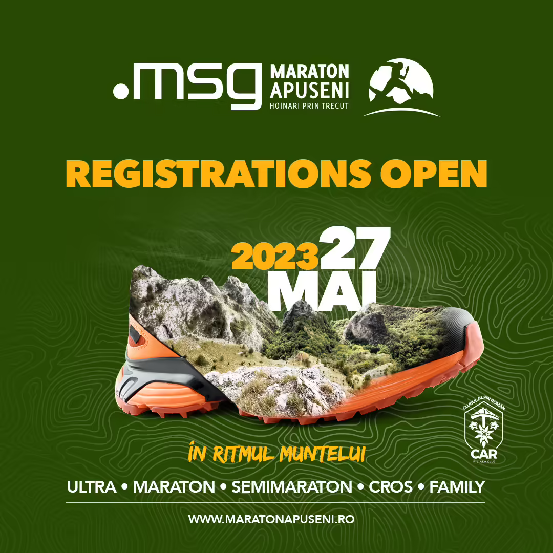 Clubul Alpin Român Filiala Cluj și partenerul oficial msg România anunță cu voioșie că înscrierile la .msg Maraton Apuseni 2023 sunt oficial deschise! Vă anunțăm cu voioșie că înscrierile la .msg Maraton Apuseni 2023 sunt oficial deschise! Haideți să ne